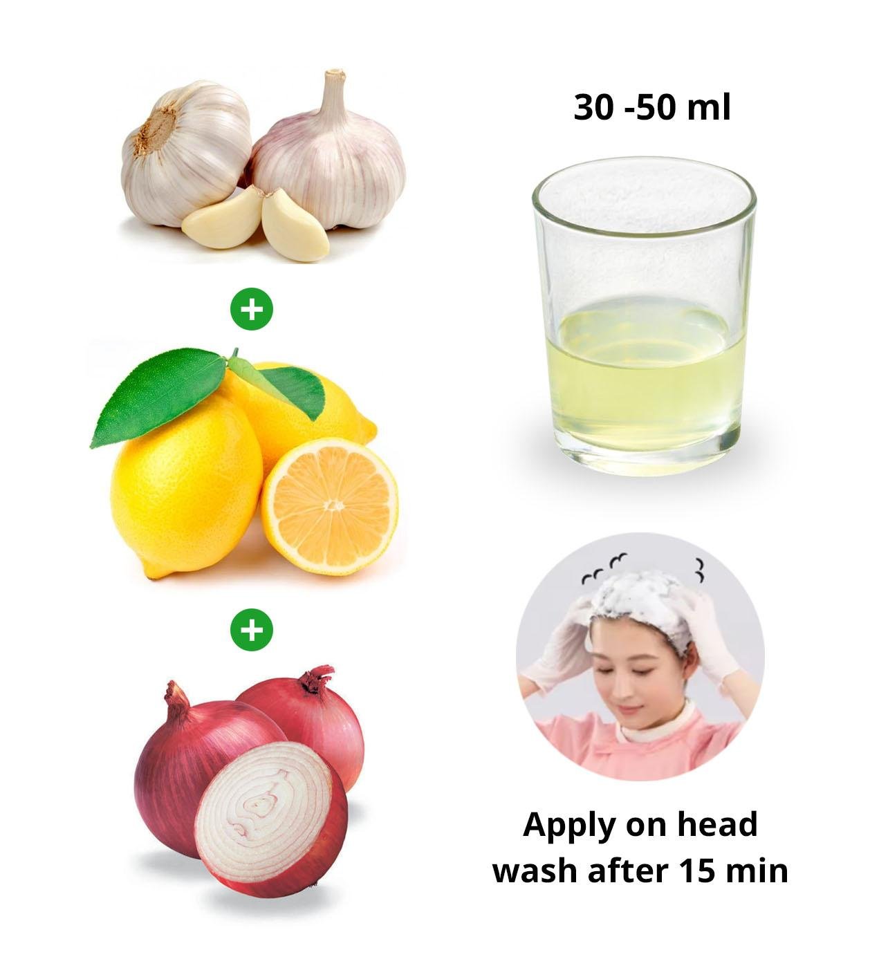 - Garlic + Onion + Lemon mixed Juice apply over the skull and wash after 20 min.